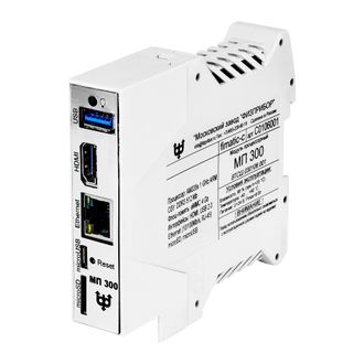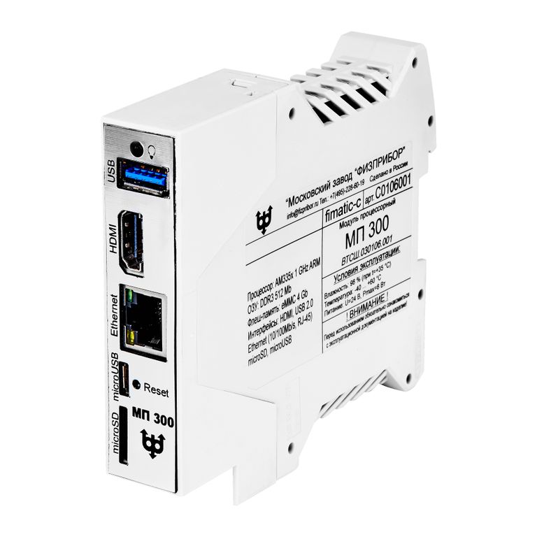 Модуль процессорный МП 300 Оформить заказ МП 300 предназначен для использования в системах автоматизированного управления АСУ с установкой на DIN рельс 35 мм. МП 300 предназначен для использования в системах автоматизированного управления АСУ с установкой на DIN рельс 35 мм. Описание Описание Характеристики модуля Процессор AM335x 1GHz ARM Оперативная память 512 Mb DDR3 Флэш-память eMMC 4 Gb Ethernet 10/100 Mb/s, RJ-45 USB 2.0 1 порт microUSB 1 порт microSD 1 порт Графический интерфейс Analog RGB (rear) (UXGA, 60 Гц), HDMI 1.4a Степень защиты IP20 Напряжение питания плюс 24 В Потребляемая мощность не более 3 Вт Поддерживаемые ОС Linux® Масса не более 0,5 кг Габаритные размеры не более 114х100х23 мм. МП 300 предназначен для непрерывной круглосуточной эксплуатации. Климатические условия эксплуатации: интервал температуры от минус 40 до плюс 70 °С; относительная влажность воздуха до 98 % при плюс 35 °С; атмосферное давление от 84 до 106,7 кПа.